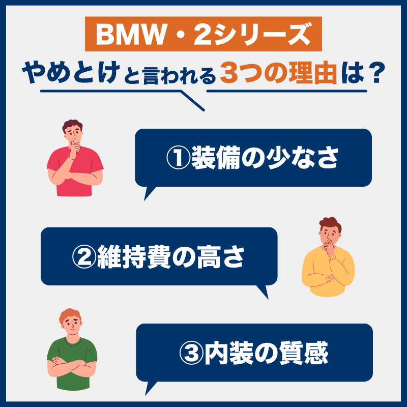ここでは、BMW・2シリーズが「やめとけ」と言われる代表的な理由を3つにまとめて紹介します。