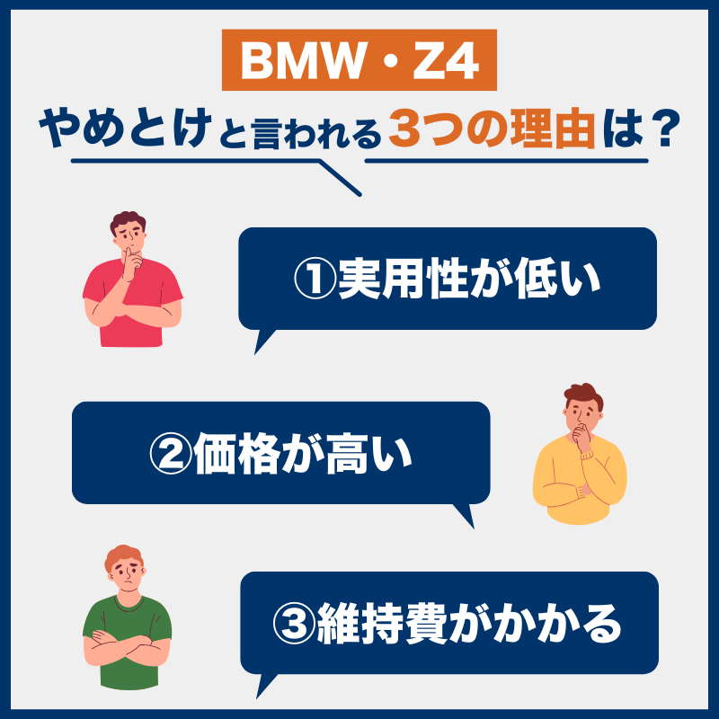 ここでは、BMW・Z4を「やめとけ」と感じた人が後悔した理由を、特に多かった3つのポイントに絞って解説します。