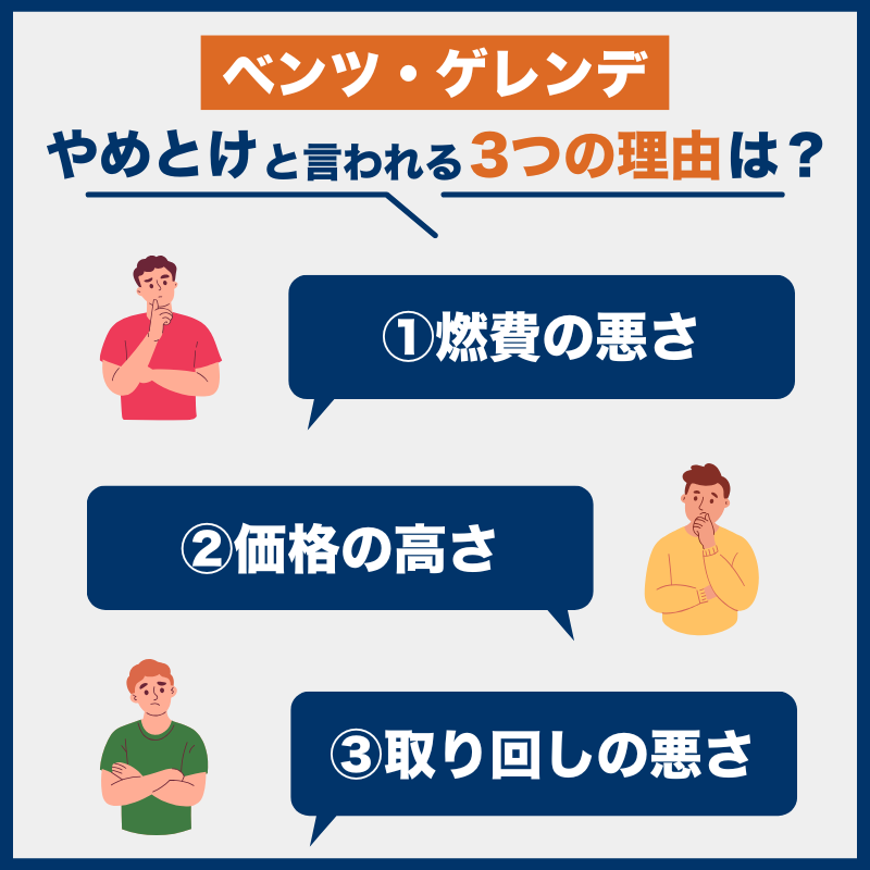 ベンツ・ゲレンデに不満を持つユーザーの多くは、主に燃費・価格・取り回しの3点に課題を感じている傾向があります。