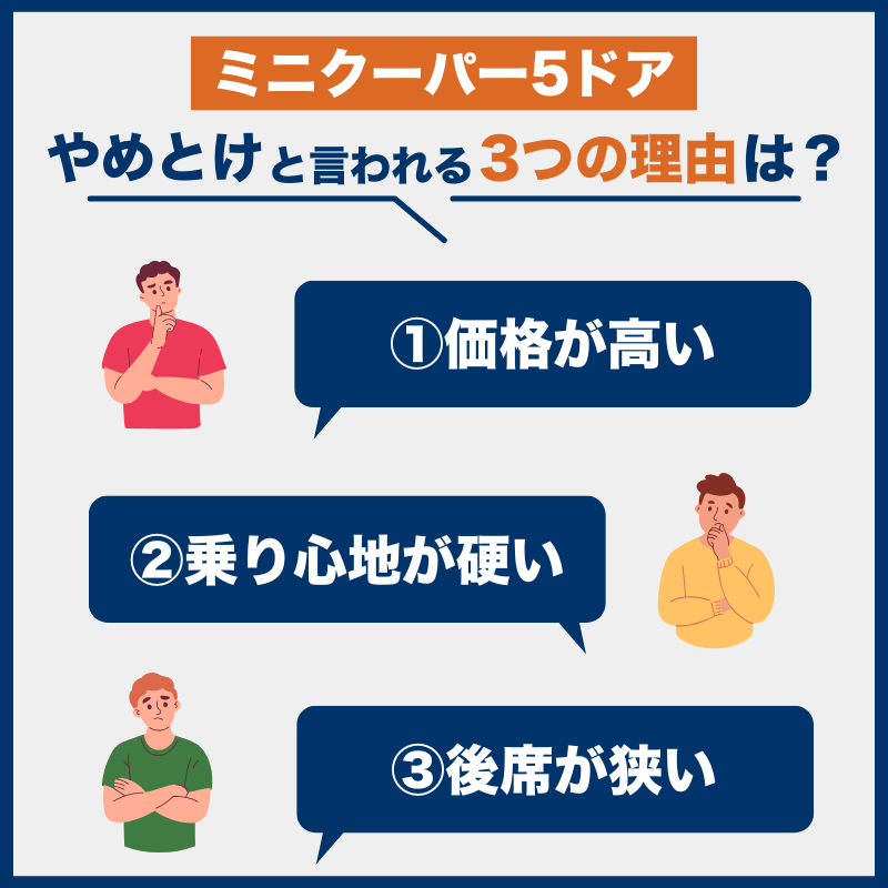 ここでは、ミニクーパー5ドアが「やめとけ」と言われがちな3つの理由を詳しく解説します。