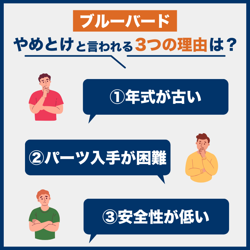 ここでは、ブルーバードを「やめとけ」と言われる主な理由を3つに絞って詳しく解説します。