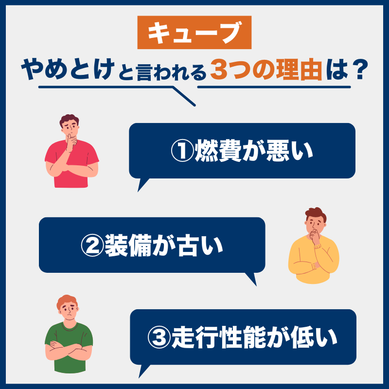 キューブは個性的なデザインや室内の広さを重視する人には魅力的ですが、燃費や装備の古さが気になる人には不向きです。