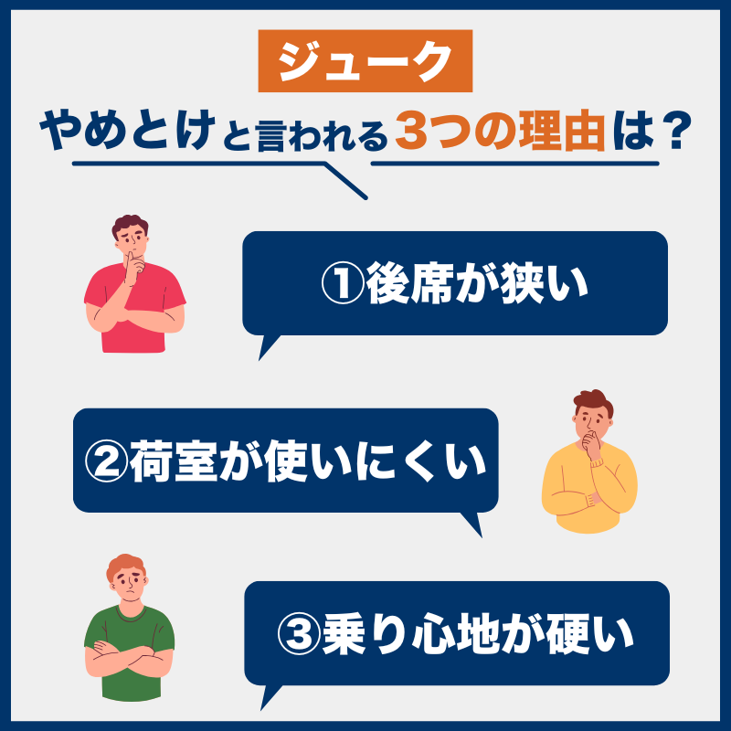ジュークがやめとけと言われる理由は「後席が狭い」「荷室が使いにくい」「乗り心地が硬い」の3つ