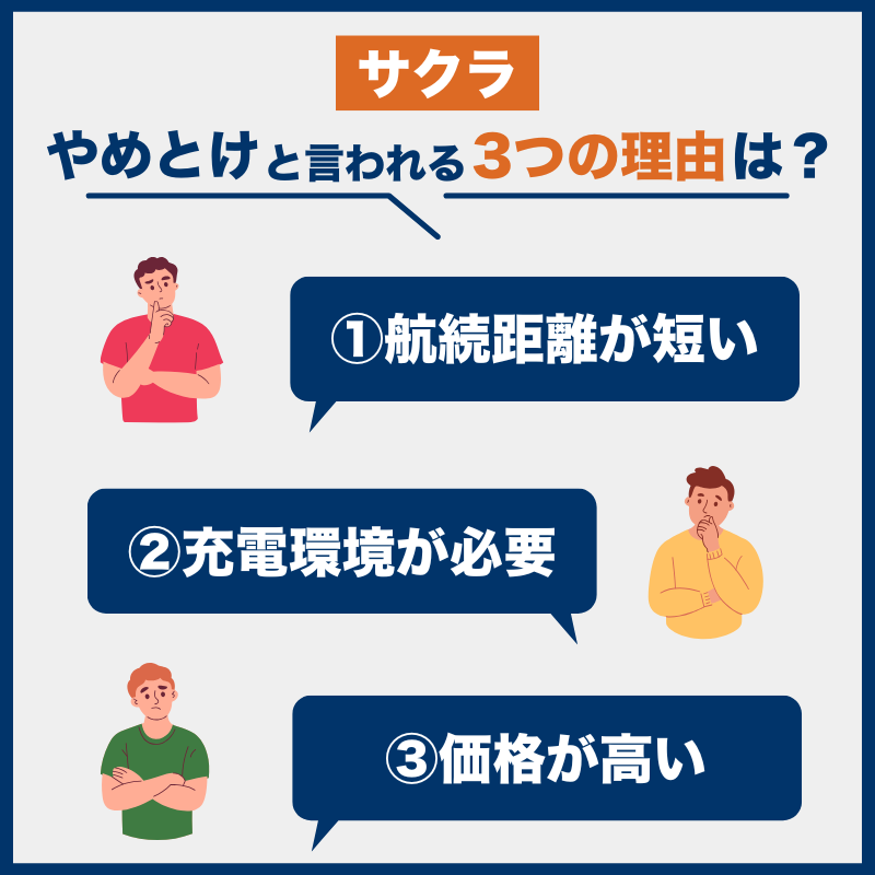 サクラがやめとけと言われる理由は「航続距離が短い」「充電環境が必要」「価格が高い」の3つ