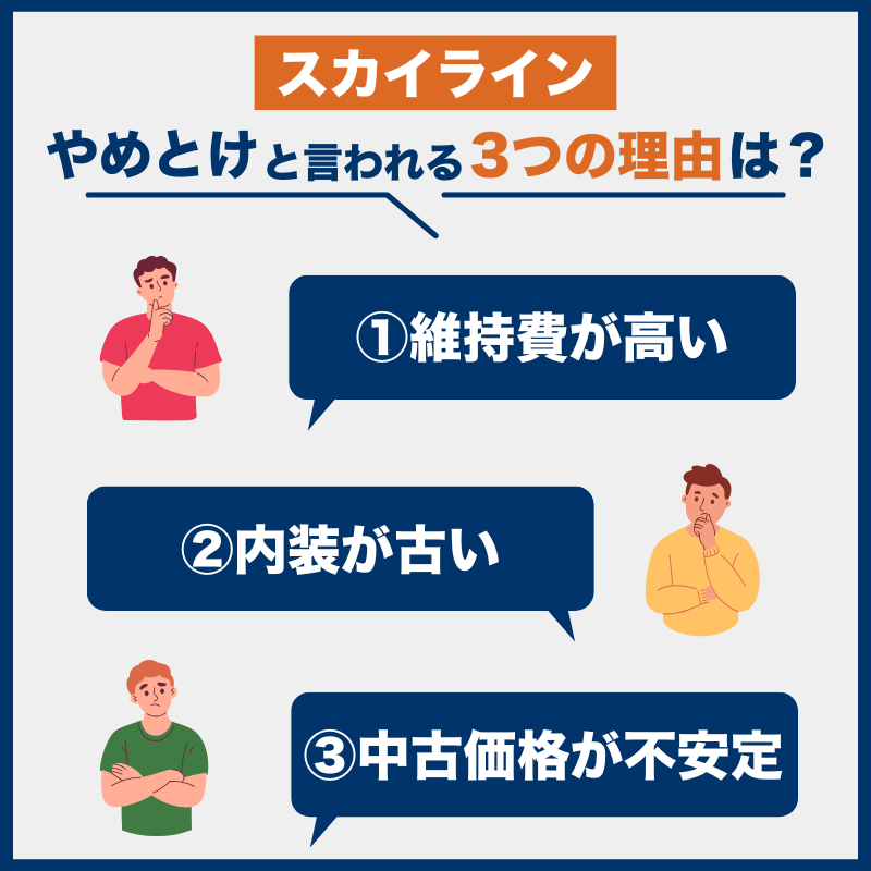スカイラインがやめとけと言われる理由は「維持費が高い」「内装が古い」「中古価格が不安定」の3つ