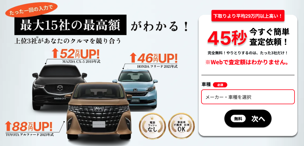 一括査定サイトなら、たった45秒で最大15社から一括査定をしてもらえるため、高価売却が期待できます。